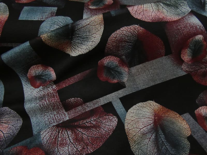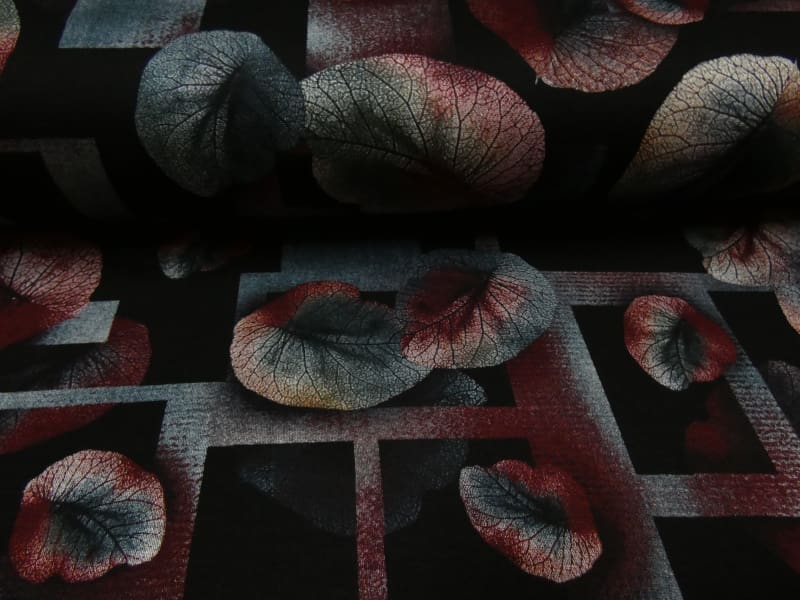 Leuke bedrukte Punta di Roma, zwarte basis met abstract bloem dessin in warme herfst kleuren. Door de gebruik van deze warme kleuren past deze zwart, bordeaux en petrol geklerde punta di roma perfect in uw winter gardarobe. Punta di roma is een zware jersey kwaliteit , zoals elk breisel enigszins elastisch. Gemakkelijk te verwerken, comfortabel in het dragen en gemakkelijk te wassen.