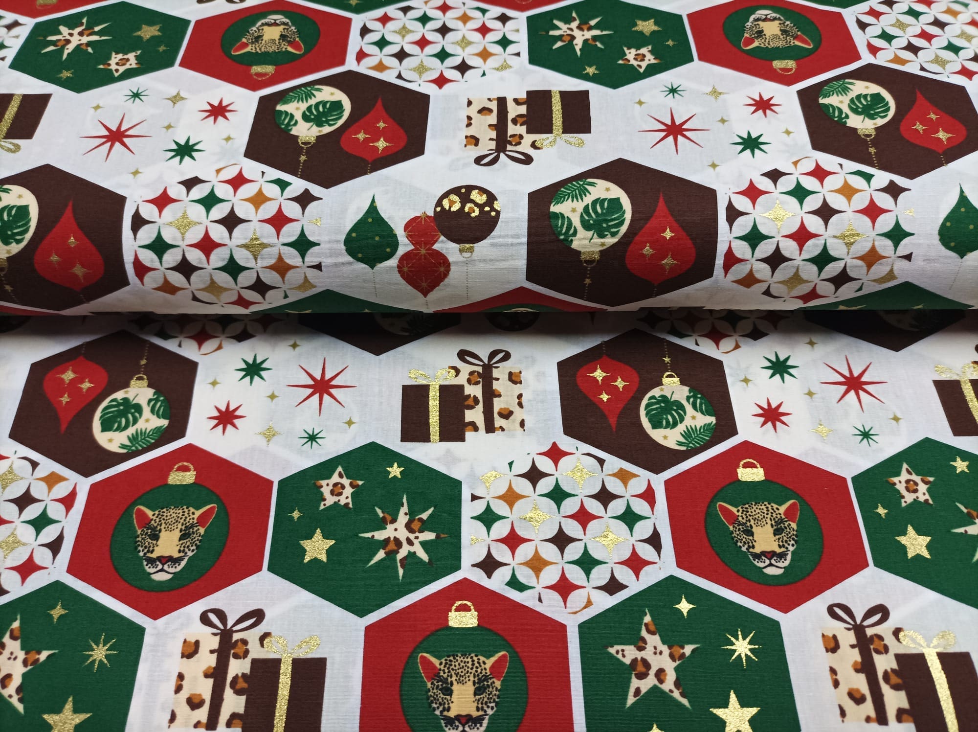 dit vrolijke ecru kleurige kerststofje met rood en groen bedrukt in honingraat motief en vrolijk dessin. uitgevoerd in een 100% katoen kwaliteit. Deze tijdloze katoenen kerststof is elk jaar weer leuk! Wordt veel gebruikt voor tafelkleden, servetten en kerst slingers, maar een echte hobbyist gebruikt het ook rustig voor het maken van kerstkaarten. Maar ook voor kleding is deze ecru bedrukte kerststof prima geschikt.