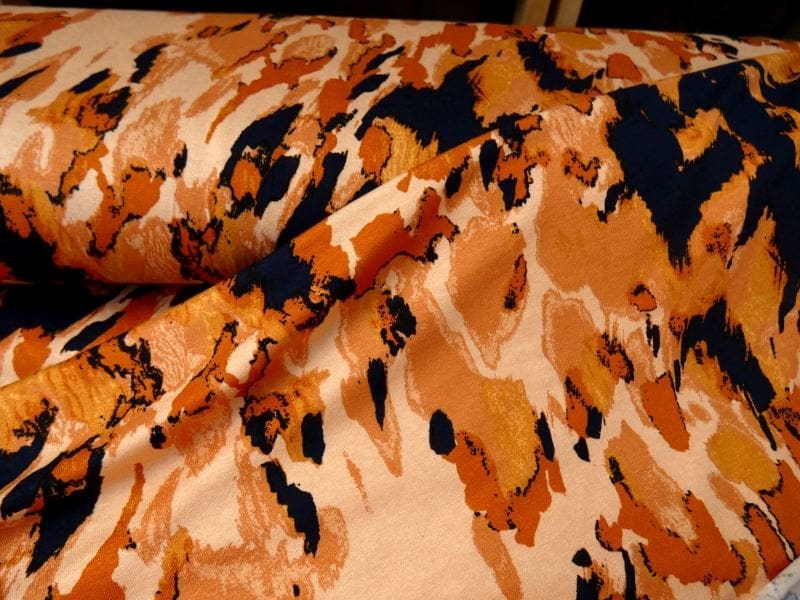 Deze met grafische print bedrukte tricot in warme organische kleuren is een eyecatcher in elke voorjaar/zomer gardarobe. Gemakkelijk te combineren door de warme natuurlijke kleuren. Deze bedrukte tricot met grafische is ideaal om bijvoorbeeld een shirt of jurkje van te maken.