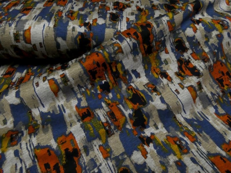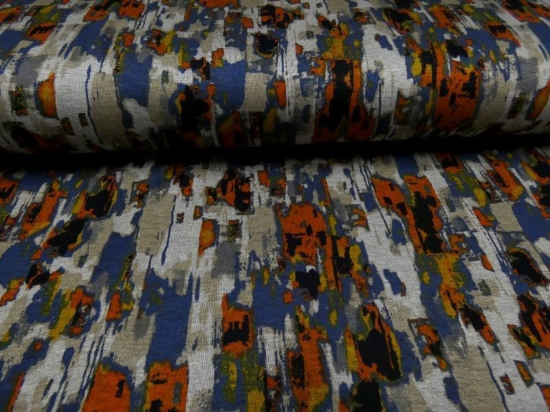 Leuke bedrukte Punta di Roma, met natuurlijke kleuren en abstract dessin. Door de gebruik van de kleuren terra, blauw, oker, zand en beige is deze opvallende punta di roma gemakkelijk te combineren en past perfect in uw winter gardarobe. Punta di roma is een zware jersey kwaliteit , zoals elk breisel enigszins elastisch. Gemakkelijk te verwerken, comfortabel in het dragen en gemakkelijk te wassen.