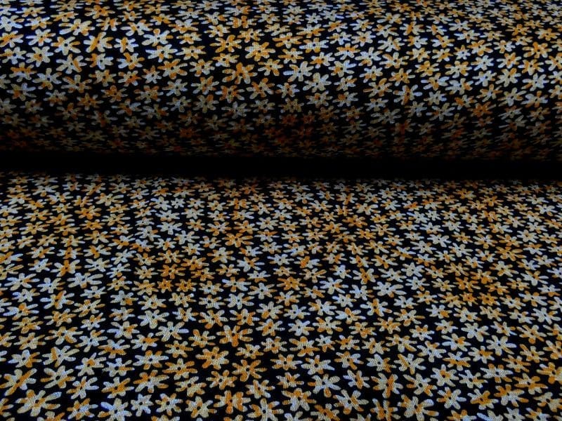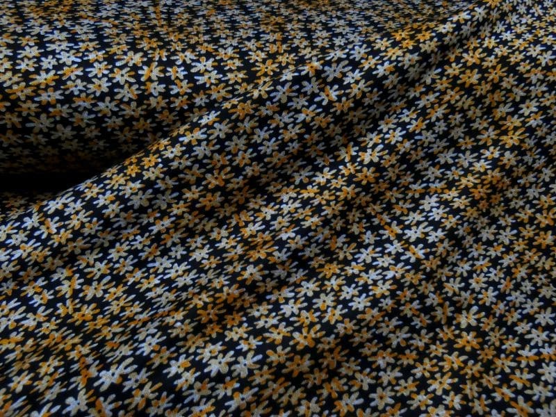 Leuke bedrukte Punta di Roma, in zwarte basis kleur met fijn bloemetjes dessin in vrolijke herfst kleuren. Het gebruik van de kleuren donker blauw met ecru, beige, oker geel overgaand in roest geeft deze gebloemde punta een warme vrolijke uitstraling. gardarobe een impuls. Punta di roma is een zware jersey kwaliteit , zoals elk breisel enigszins elastisch. Gemakkelijk te verwerken, comfortabel in het dragen en gemakkelijk te wassen.