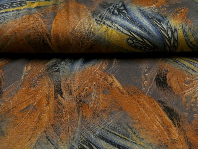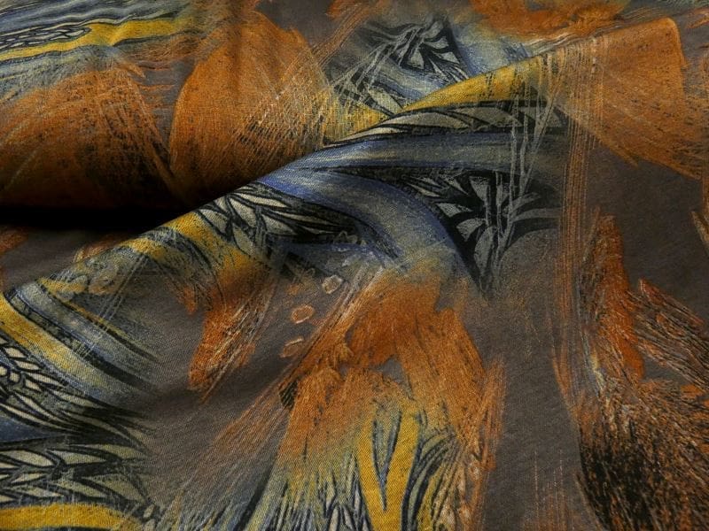 Leuke bedrukte Punta di Roma, met warme kleuren en natuurlijk dessin. Door de gebruik van de kleuren terra en groen past deze opvallende punta di roma perfect in uw winter gardarobe. Punta di roma is een zware jersey kwaliteit , zoals elk breisel enigszins elastisch. Gemakkelijk te verwerken, comfortabel in het dragen en gemakkelijk te wassen.