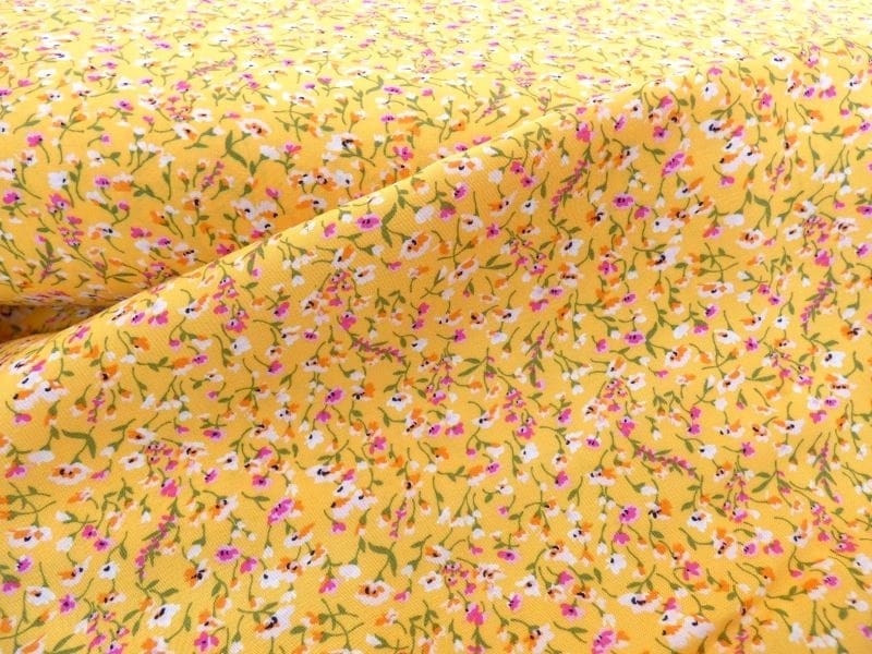 Deze gele viscose stof met bloemetjes dessin is een must have voor een warme zomer dag. Ideaal voor een soepel vallend jurkje of blouse. Viscose is een stof die zich gemakkelijk laat wassen en vrijwel niet gestreken hoeft te worden, met een zachte touch en koel in het dragen.