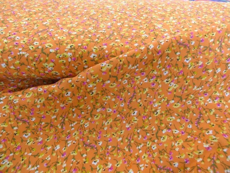 Deze oranje gebloemde viscose stof is een must have voor een warme zomer dag. Ideaal voor een soepel vallend jurkje of blouse. Viscose is een stof die zich gemakkelijk laat wassen en vrijwel niet gestreken hoeft te worden, met een zachte touch en koel in het dragen.