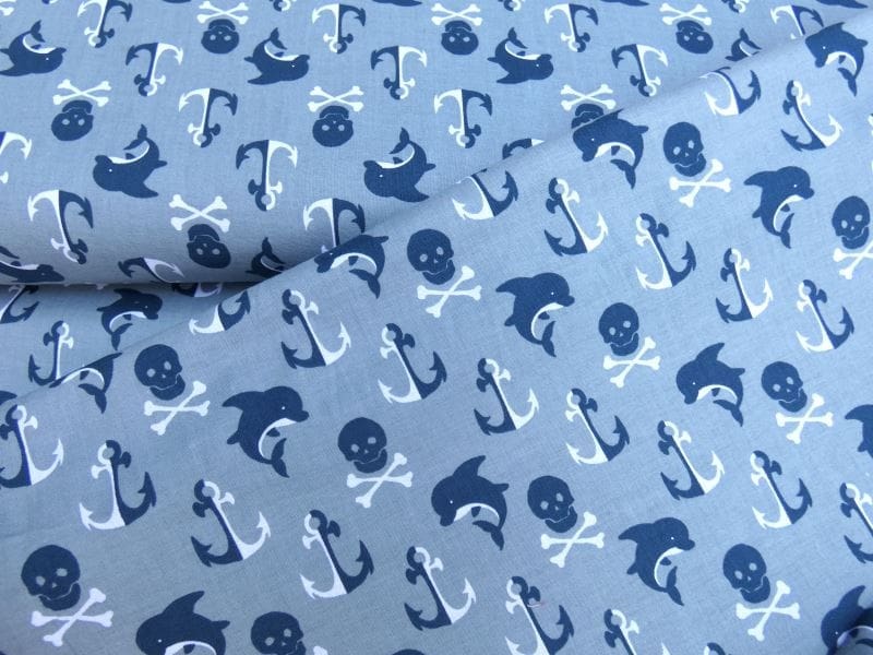 Deze licht grijze bedrukte katoen met piraten print, is een ideale stof als je op zoek bent naar een stoer jongens stofje. De samenstelling van 100% katoen, staat garant voor veilig gebruik ook bij baby. Ook is deze stof geschikt om te wassen op 90 graden (kookwas) en gemakkelijk te verwerken.