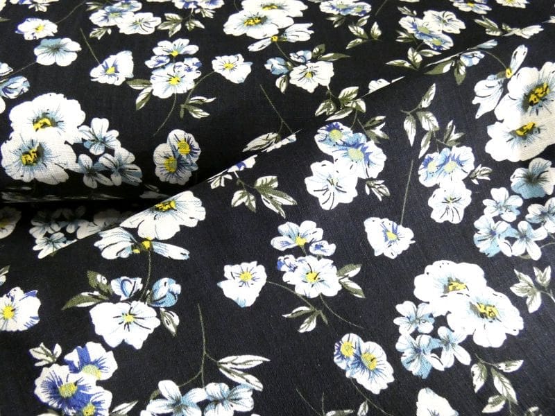 Deze donker blauwe stretch met frisse licht blauwe bloemetjes dessin in een viscose/elasthan mix met linnenlook is de ideale stof voor een mooie voorjaar of zomer dag. Het casual navy in combinatie met het frisse licht blauwe bloemetjes dessin geeft deze linnenlook een zomerse en vlotte uitstraling. De samenstelling van 5%elasthan en 95%viscose zorgt voor fijne eigenschappen die je van een volledig natuurlijke stof verwacht, soepele valling, goed ademend, snel droog en duurzaam in gebruikt, en maakt de stof is bijzonder geschikt voor jurkjes, blouses en rokjes.