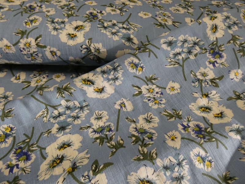 Dit frisse licht blauwe bloemetjes dessin in een viscose/elasthan mix met linnenlook is de ideale stof voor een mooie voorjaar of zomer dag. Het populaire zachte blauwe bloemetjes dessin geeft deze linnenlook een zomerse vlotte uitstraling. De samenstelling van 5%elasthan en 95%viscose zorgt voor fijne eigenschappen die je van een volledig natuurlijke stof verwacht, soepele valling, goed ademend, snel droog en duurzaam in gebruikt, enmaakt de stof is bijzonder geschikt voor jurkjes, blouses en rokjes.