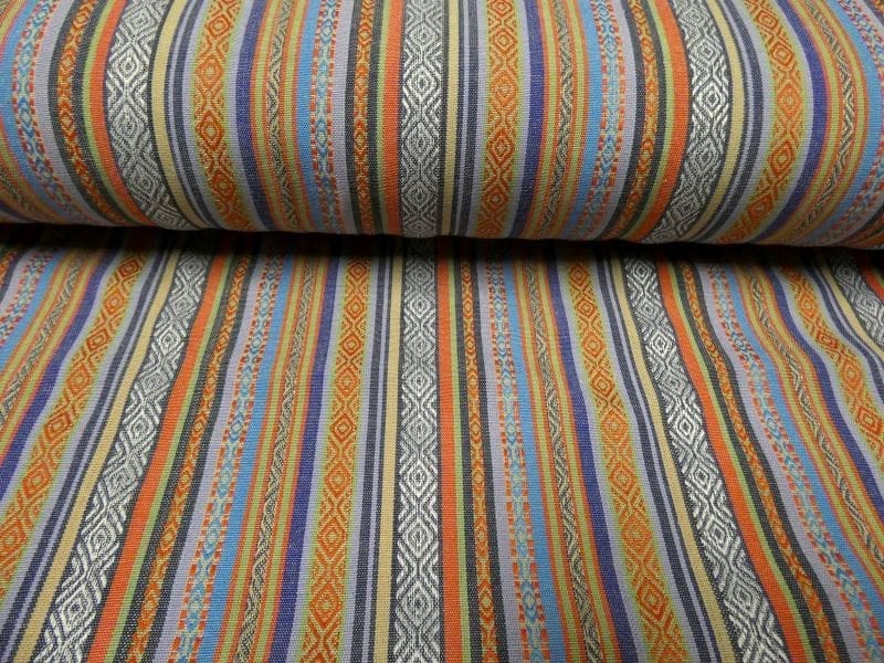 Deze vrolijke streepjes stof in frisse kleuren is een ideale stof om een leuk sfeertje te creëren. Door de samenstelling van deze fris gekleurde streepjes stof, 50%katoen/50%polyester is deze duurzaam en kleur echt, De ideale stof voor het bekleden van kussens, het maken van tassen of decoratie. Weg met een saaie uni stof, vrolijk de boel op met zo’n leuke streepte weefstof.