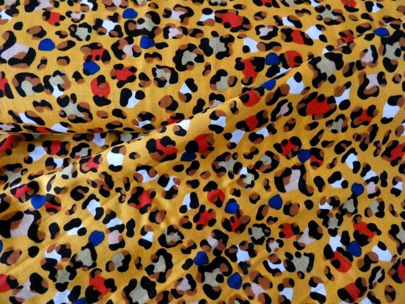 Deze oker gele, 100% viscose stof met vrolijk gekleurd printje is een klassieker en een echte must have voor een warme zomer dag. Ideaal voor een soepel vallend jurkje of blouse. 100% viscose is een stof die zich gemakkelijk laat wassen en vrijwel niet gestreken hoeft te worden, met een zachte touch en koel in het dragen.