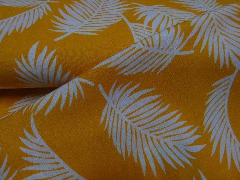 Deze oker gele borken cr^pe met frisse ecru palmblad dessin in 100% viscose is de ideale stof voor een mooie voorjaar of zomer dag. De vrolijke oker gele kleur in combinatie met de zomerse ecru kleurig palmblad dessin geeft deze borkencrêpe een zomerse en vlotte uitstraling. De samenstelling van 5%elasthan en 95%viscose zorgt voor fijne eigenschappen die je van een volledig natuurlijke stof verwacht, soepele valling, goed ademend, snel droog en duurzaam in gebruikt, en maakt de stof is bijzonder geschikt voor jurkjes, blouses en rokjes.