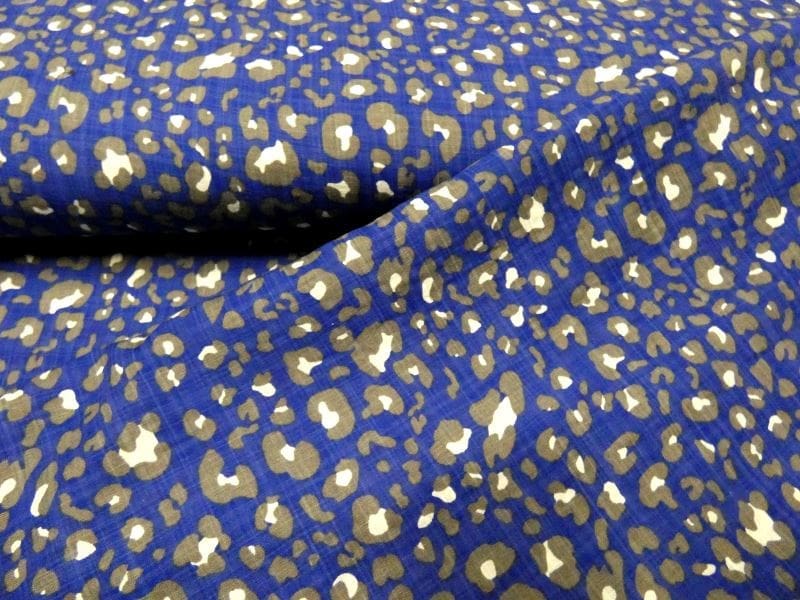 Deze luchtige bedrukte katoen/viscose mix met linnenlook is de ideale stof voor een mooie voorjaar of zomer dag. Het kobalt blauwe panter printje geeft deze linnenlook een frisse uitstraling. De samenstelling van 60%katoen en 40%viscose zorgt voor fijne eigenschappen die je van een volledig natuurlijke stof verwacht, soepele valling, goed ademend, snel droog en duurzaam in gebruikt, enmaakt de stof is bijzonder geschikt voor jurkjes, blouses en rokjes.
