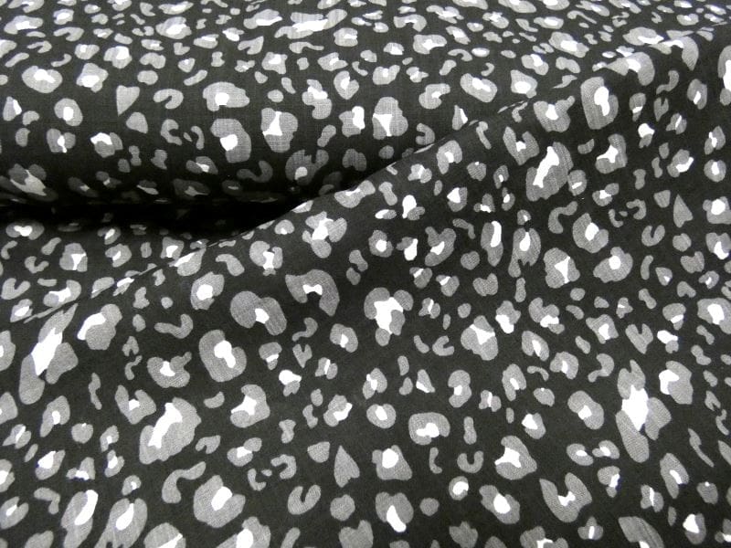 Deze luchtige bedrukte katoen/viscose mix met linnenlook is de ideale stof voor een mooie voorjaar of zomer dag. Het zwart/grijze panter printje geeft deze linnenlook een frisse uitstraling. De samenstelling van 60%katoen en 40%viscose zorgt voor fijne eigenschappen die je van een volledig natuurlijke stof verwacht, soepele valling, goed ademend, snel droog en duurzaam in gebruikt, enmaakt de stof is bijzonder geschikt voor jurkjes, blouses en rokjes.