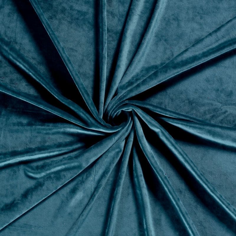Deze prachtige kwaliteit stretch fluweel in trendy petrol kleur, is een bi-stretch kwaliteit. De petrol stretch velours voelt heerlijk zacht aan en valt soepel. Door de samenstelling van 92%polyester/8%elasthan, draagt deze stof fijn en is zelfwasbaar. Het is een luxe ogende stof, geschikt voor jasjes, broeken, topjes, jukjes en jumpsuits.