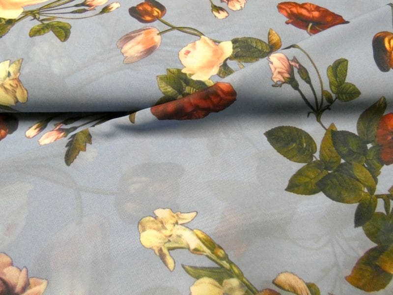 Deze heerlijk soepel vallende licht blauwe blauwe chiffon met prachtig bloem dessin, is de ideale stof voor een overlay van een jurk, een blouse of een rok.  Maar ook als basis voor een sjaal komt deze prachtige bloemen print goed uit. Oorspronkelijk vormde zijde de basis voor deze chiffon, maar omwille van duurzaamheid en gebruiksgemak maken we vandaag de dag gebruik van polyester.