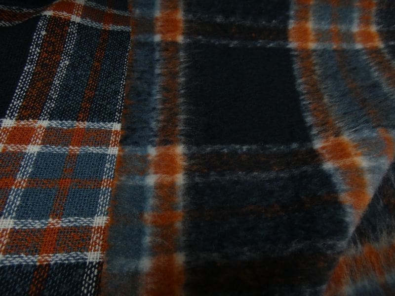 Deze geruwde ruitjes stof in blauw en roest kleur is een heerlijke warme winter stof. Deze geruite stof is ideaal als basis voor een jasje of een rok. De opgeruwd wol mix stof oogt als een kashmir wol, en voelt heerlijk zacht aan. De samenestelling van wol en polyester geven de stof fijne eigenschappen en een goede duurzaamheid.