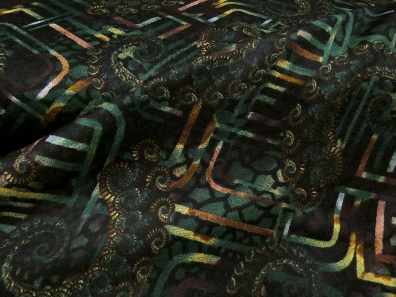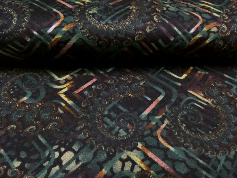Leuke bedrukte Punta di Roma, in modische herfst kleuren en abstract dessin. Door de gebruik van de kleuren zwart, groen, bruin, oker geel etc. past deze stijlvolle punta di roma stof perfect in uw winter gardarobe. Punta di roma is een zware jersey kwaliteit , zoals elk breisel enigszins elastisch. Gemakkelijk te verwerken, comfortabel in het dragen en gemakkelijk te wassen.