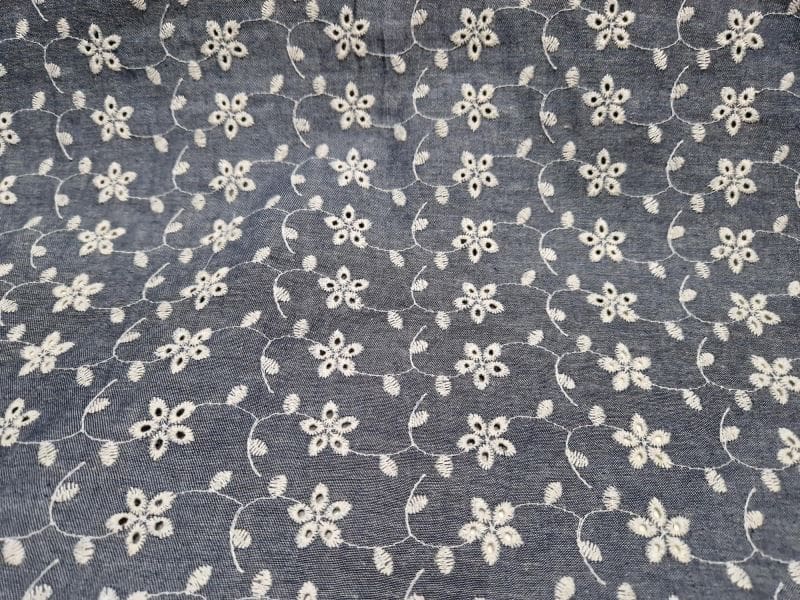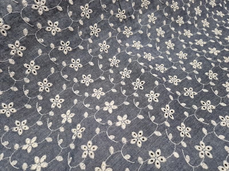 waanzinnig leuke met ecru roosjes geborduurde soepele spijkerstof