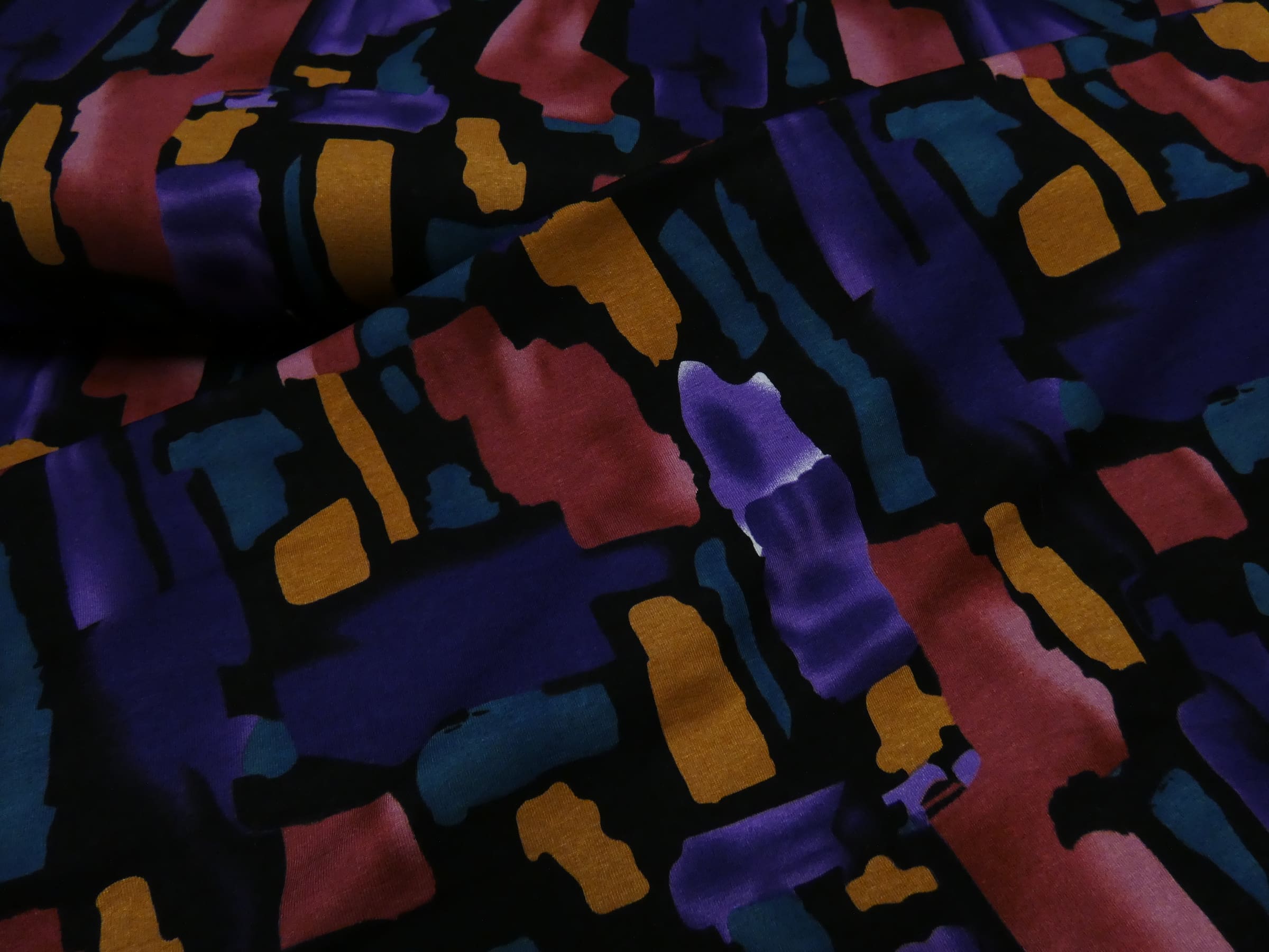 Deze bont gekleurde bedrukte tricot op zwarte basis zijn passend in elke najaars/winter gardarobe. Gemakkelijk te combineren door de diverse herfst kleuren Deze bedrukte tricot is ideaal om bijvoorbeeld een shirt of jurkje van te maken.