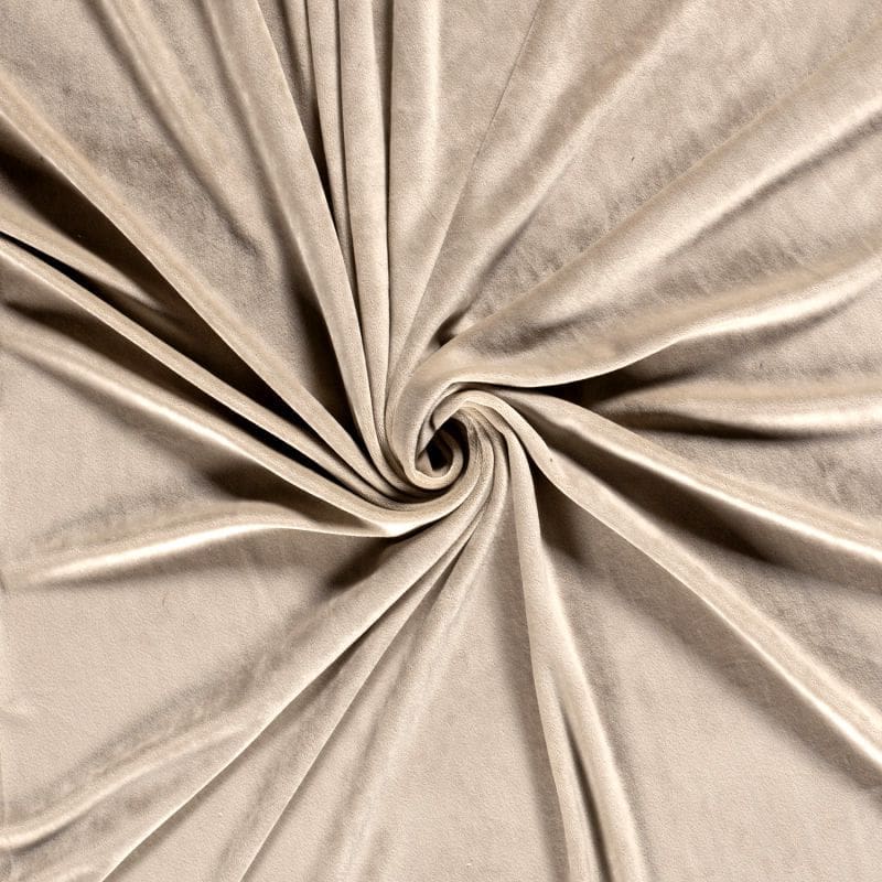 Deze prachtige kwaliteit stretch fluweel in zachte zand kleur, is een bi-stretch kwaliteit. De stretch velours voelt heerlijk zacht aan en valt soepel. Door de samenstelling van 92%polyester/8%elasthan, draagt deze stof fijn en is zelfwasbaar. Het is een luxe ogende stof, geschikt voor jasjes, broeken, topjes, jukjes en jumpsuits.