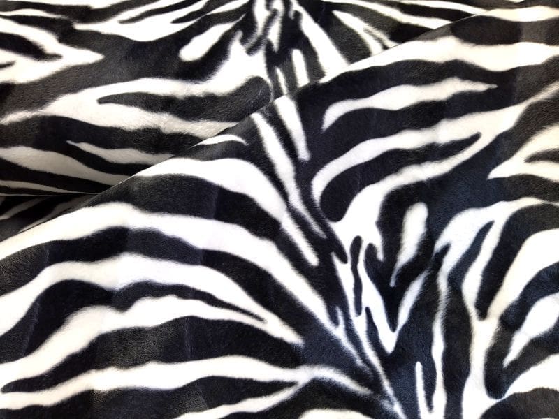 Deze mooie zwart/witte zebra print is een velboa kwaliteit. Velboa is een fleweelachtig kort geschoren bont in een 100% polyester kwaliteit. Deze zebra print wordt vaak gebruikt voor bekleding, maar is vanwegen zijn soepele karakter om prima voor kleding te gebruiken.